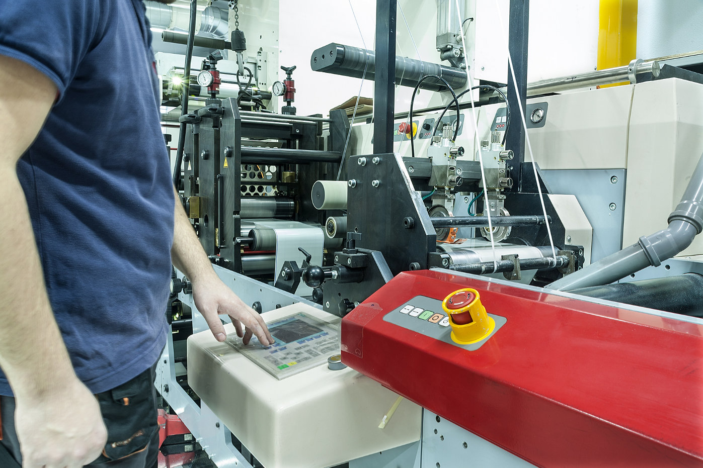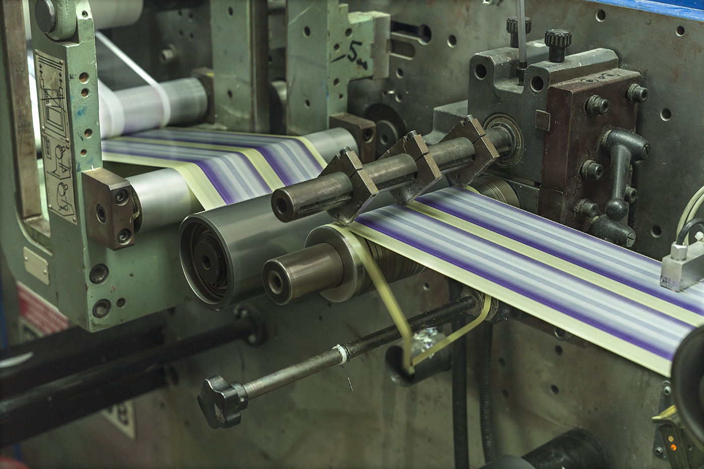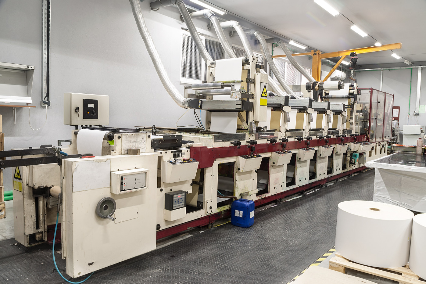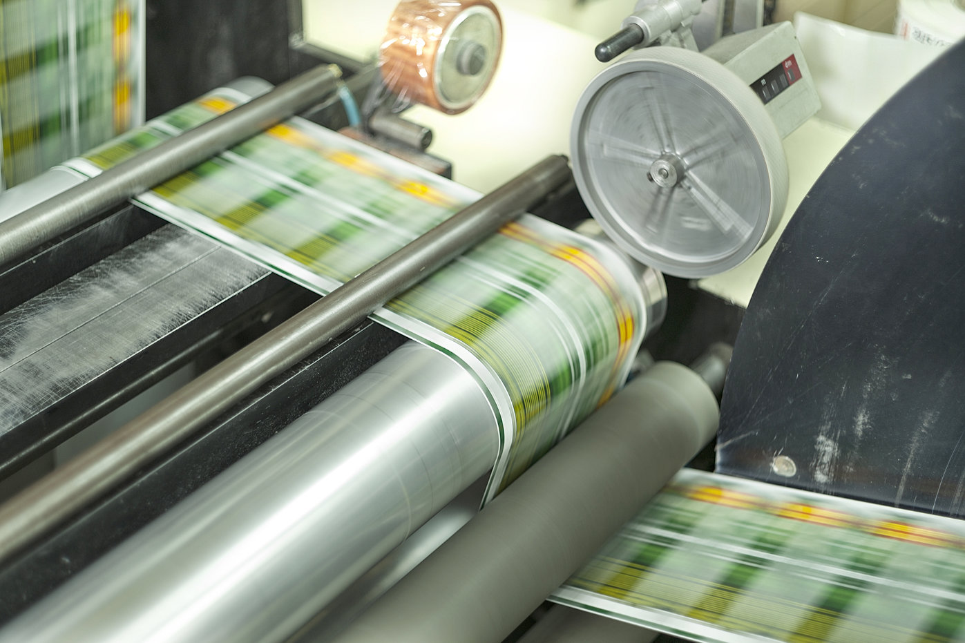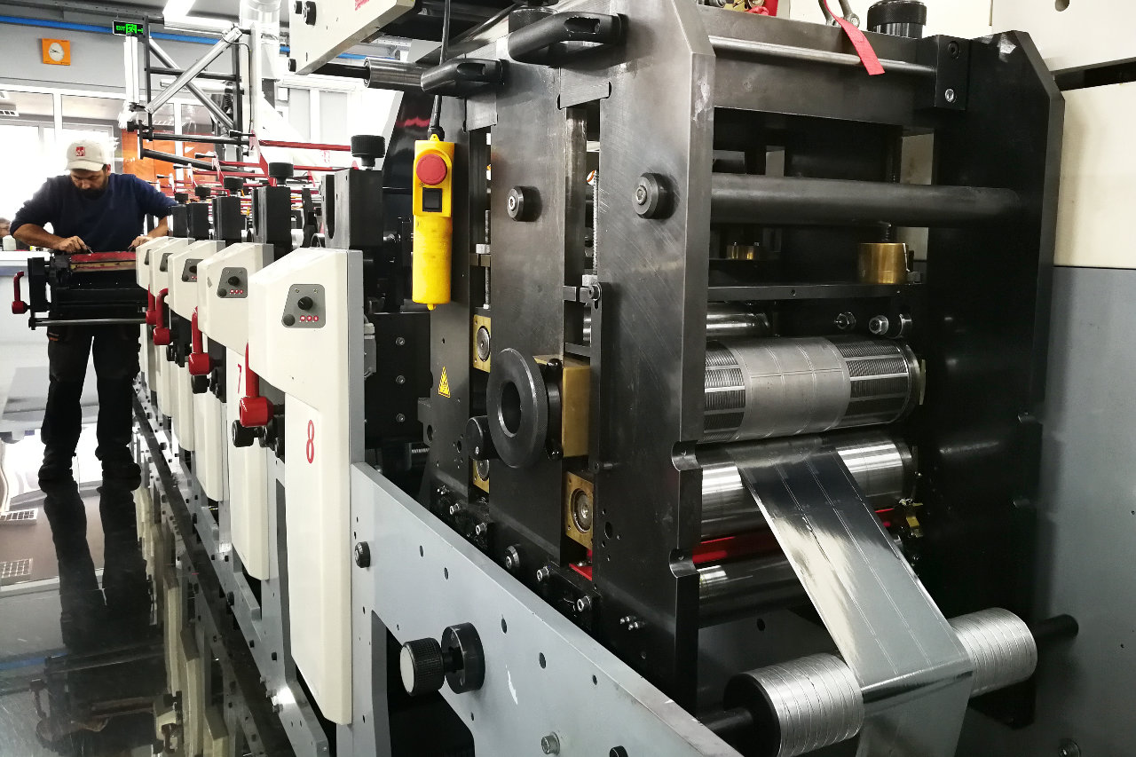 Štampa se iz rolne u rolnu. Ovo je važno zbog kasnijeg eventualnog kaširanja (laminiranja) u dupleks, tripleks i slične višeslojne materijale, kao i zbog znatno bržeg konfekcioniranja ambalaže ili apliciranja nalepnica na poluautomatskim ili automatskim aplikatorima.