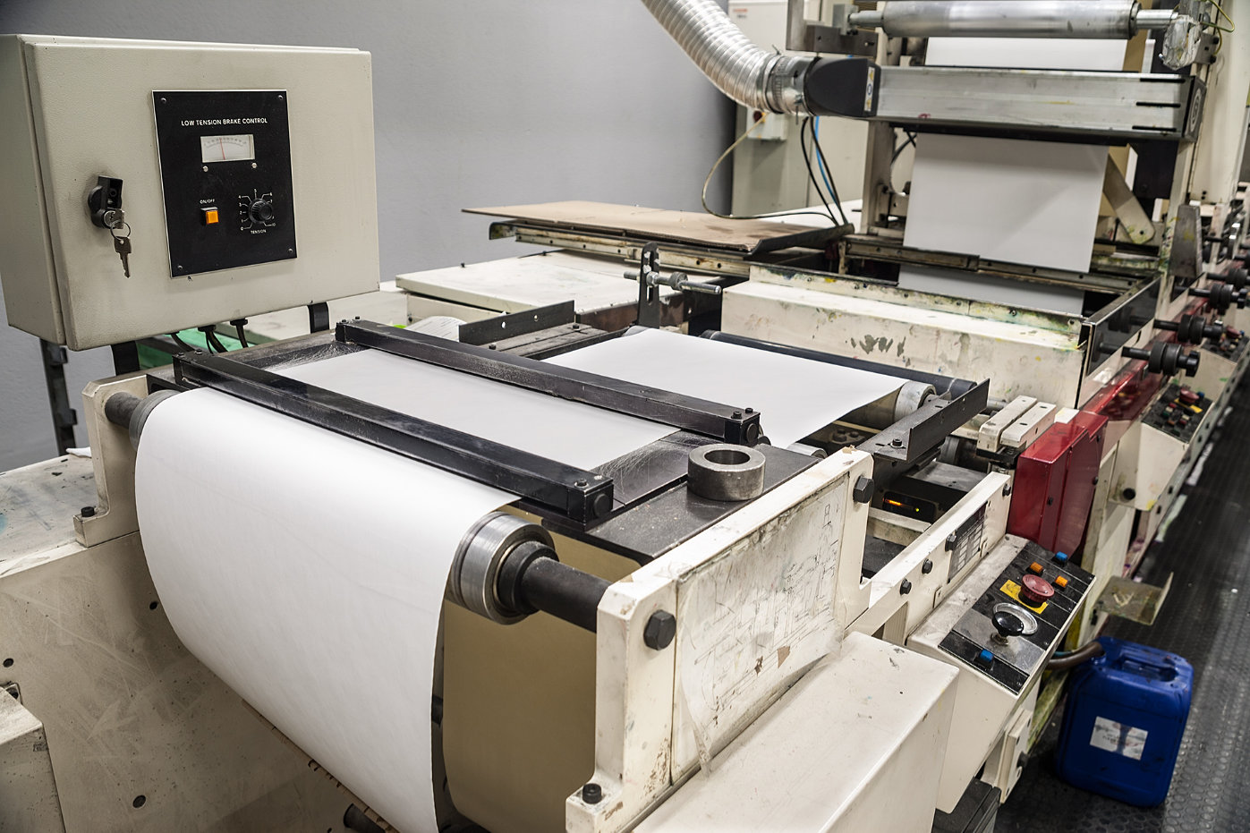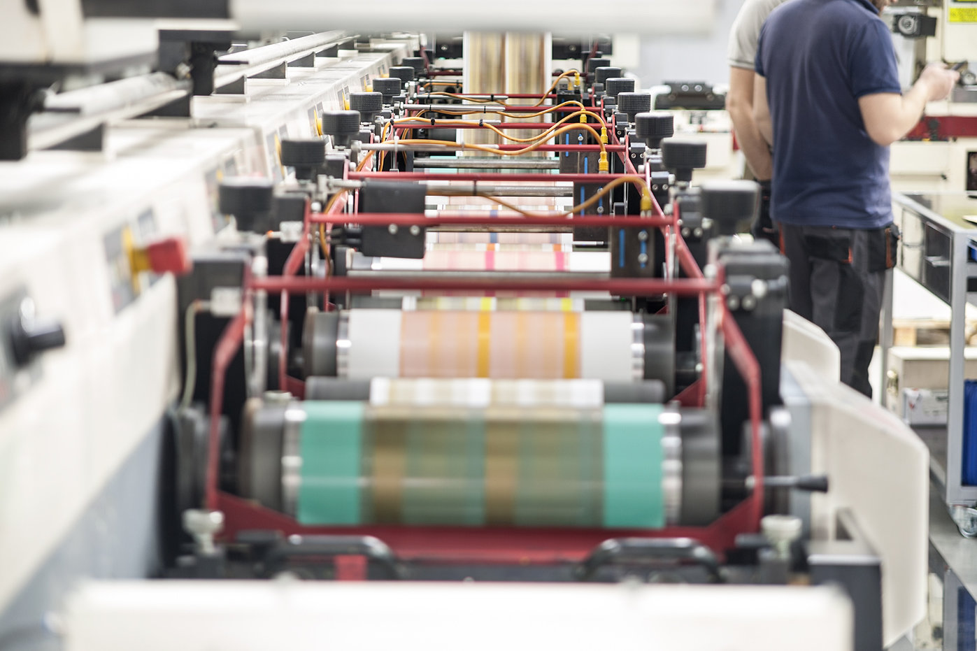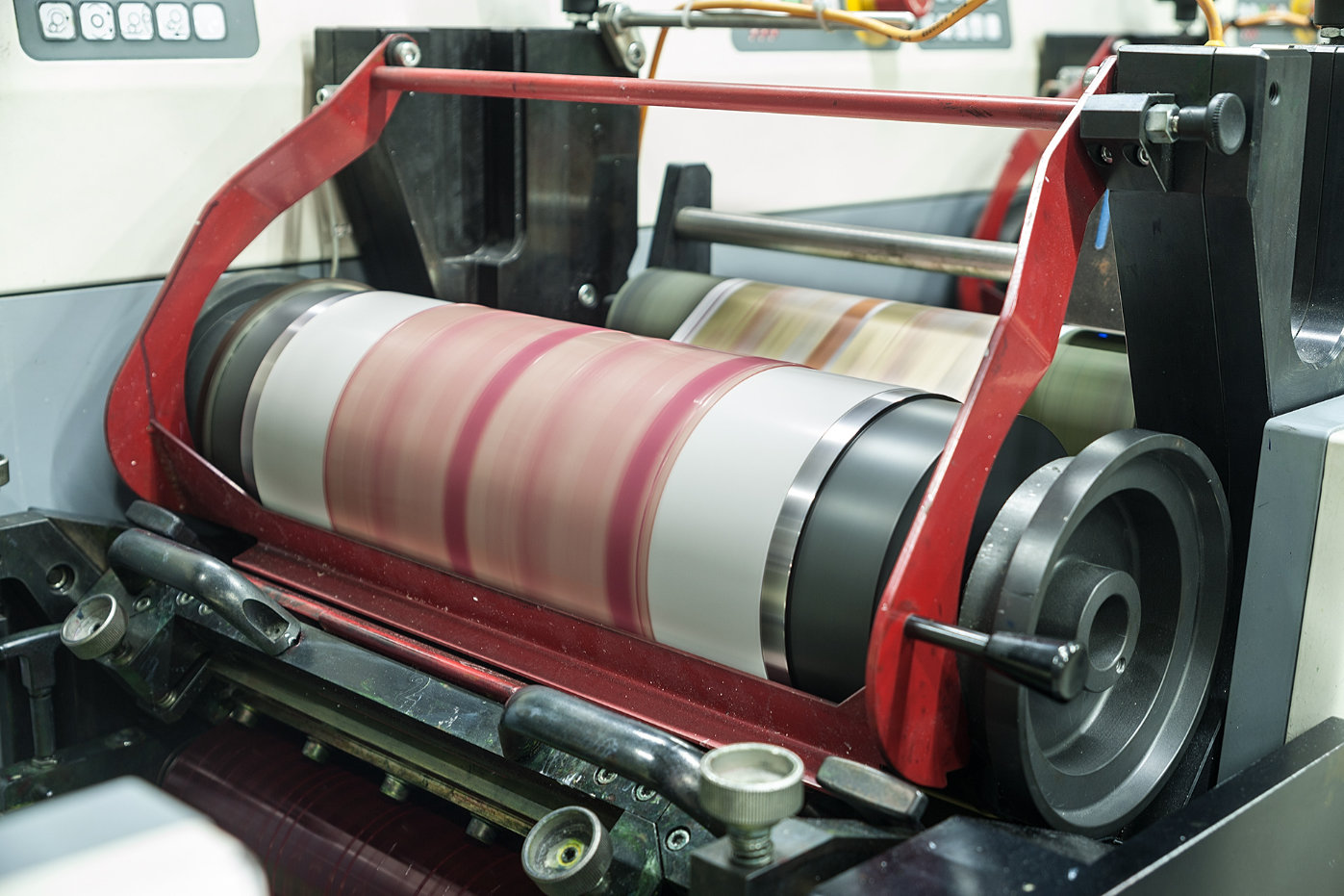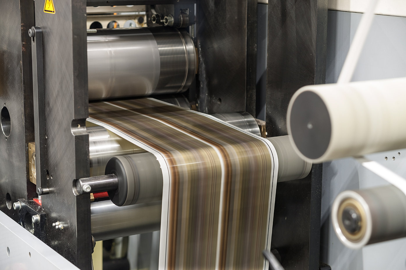 Štampa se iz rolne u rolnu. Ovo je važno zbog kasnijeg eventualnog kaširanja (laminiranja) u dupleks, tripleks i slične višeslojne materijale, kao i zbog znatno bržeg konfekcioniranja ambalaže ili apliciranja nalepnica na poluautomatskim ili automatskim aplikatorima.