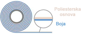 Široka paleta ribona u raznim bojama i veličinama, u zavisnosti od zelje kupca, i samog materijala na kome se štampa. Da li su to nalepnice u rolni, etikete bez lepka, ( papirne, plastične, tekstilne...), kao i u zavisnosti od otpornosti raznih uticaja ( vremenski uslovi, trenje, grebanje, smrznuti proizvodi, visoka temperatura, hemikalije, pranje.... ). Poliesterska folija, nosi pigmentsku foliju, koja ostavlja otisak na mediju uz pomoć termal transfer štampača, tačnije preko glave štampača koristeći pritisak, i elektornski zadatu temperaturu. Riboni koje proizvodi naša kompanija, imaju zaštitni sloj poliestera, koji sprečava brzo habanje termo transfer štampača, odnosno glave.